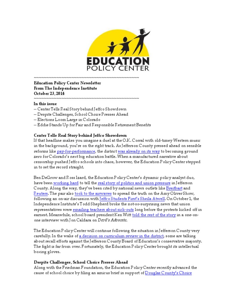 From The Independence Institute October 23, 2014 ~~~~~~~~~~~~~~~~~~~~~~~~~~~~~~~~~~~~~~~~~~ In this issue -- Center Tells Real Story behind Jeffco Showdown -- Despite Challenges, School Choice Presses Ahead -- Elections Loom Large in Colorado -- Eddie Stands Up for Fair and Responsible Retirement Benefits