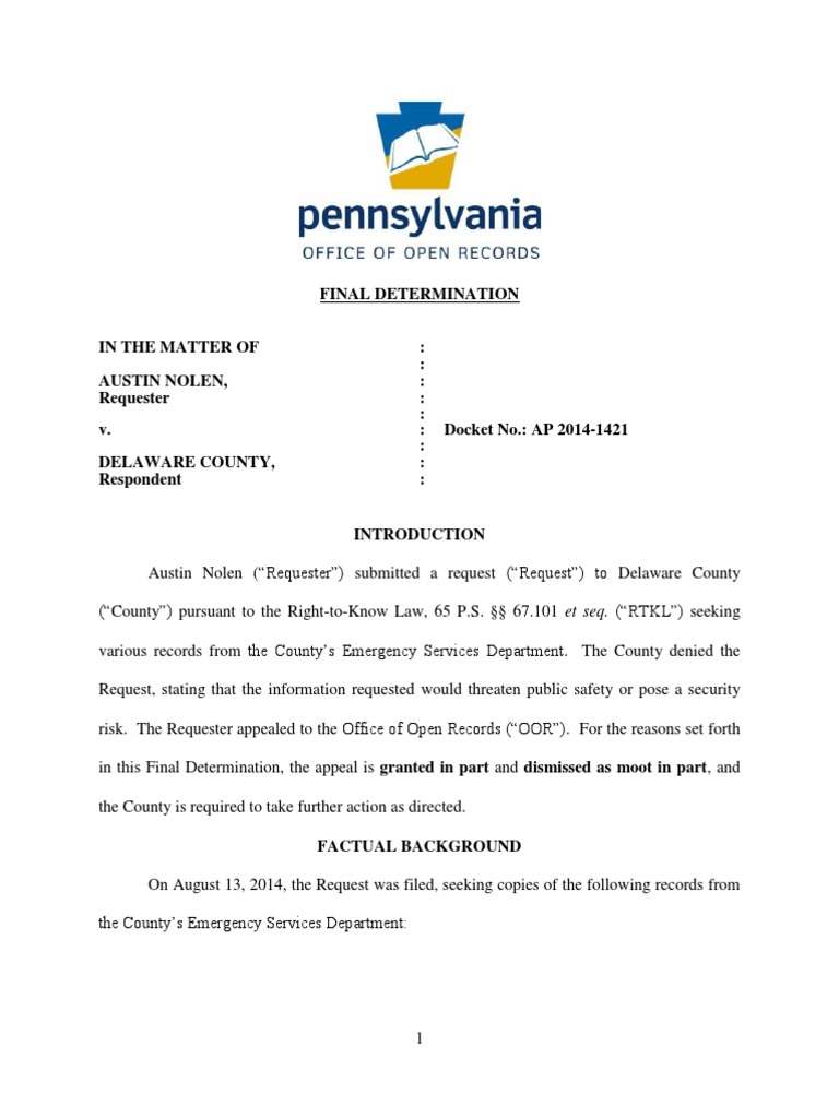 On October 9, 2014, the County submitted correspondence to the OOR stating that, to the