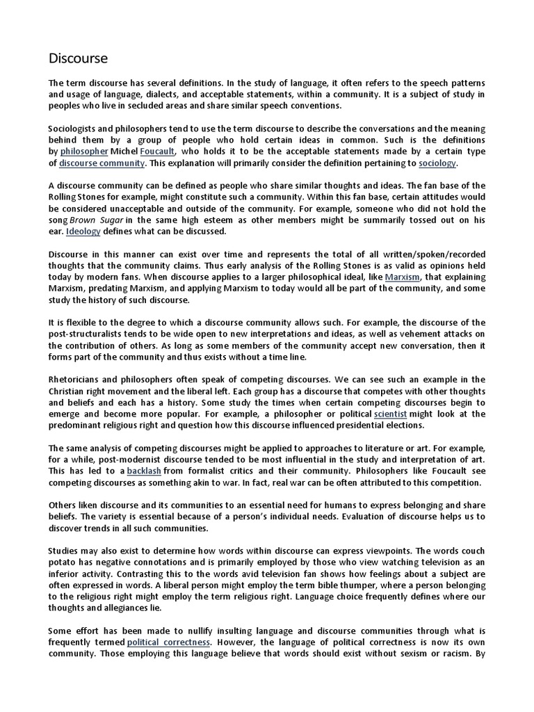 of discourse community. This explanation will primarily consider the definition pertaining to sociology.
