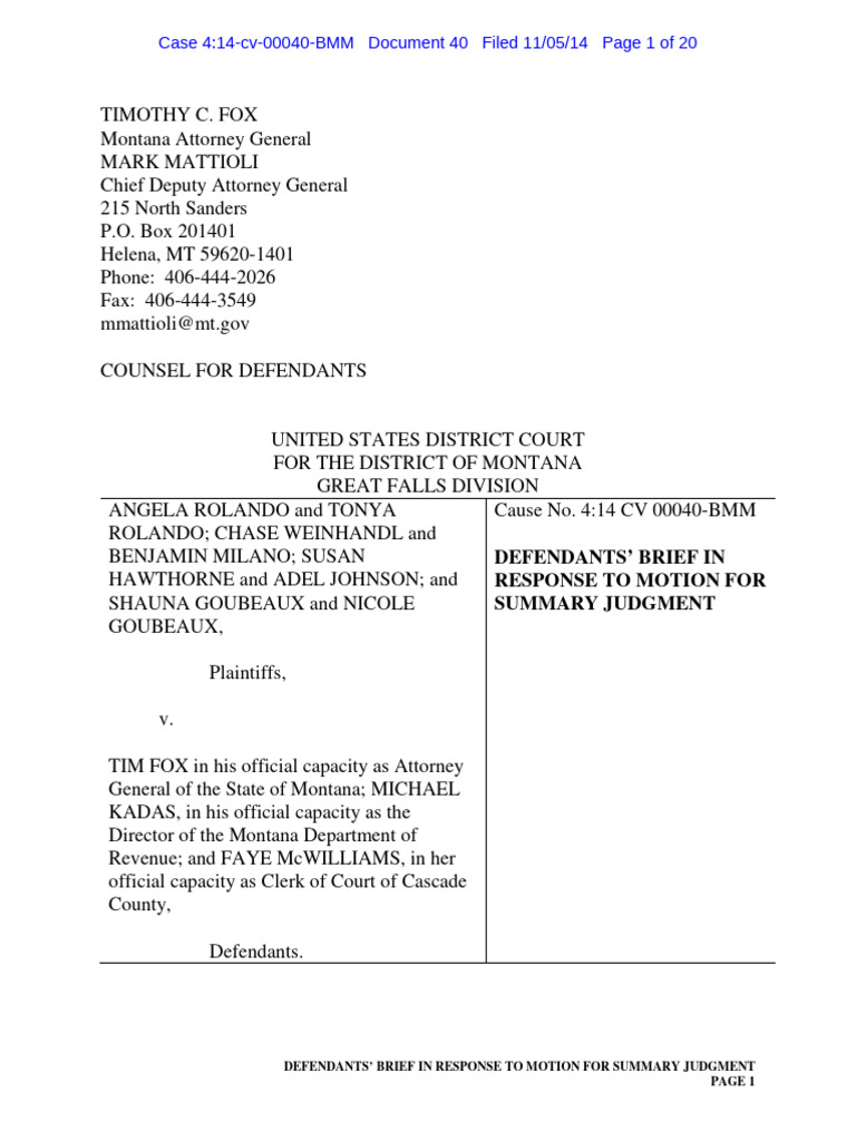 TIMOTHY C. FOX Montana Attorney General MARK MATTIOLI Chief Deputy Attorney General 215 North Sanders P.O. Box 201401 Helena, MT 59620-1401 Phone: 406-444-2026 Fax: 406-444-3549 mmattioli@mt.gov COUNSEL FOR DEFENDANTS UNITED STATES DISTRICT COURT FOR THE DISTRICT OF MONTANA GREAT FALLS DIVISION ANGELA ROLANDO and TONYA ROLANDO; CHASE WEINHANDL and BENJAMIN MILANO; SUSAN HAWTHORNE and ADEL JOHNSON; and SHAUNA GOUBEAUX and NICOLE GOUBEAUX, Plaintiffs, v. TIM FOX in his official capacity as Attorney General of the State of Montana; MICHAEL KADAS, in his official capacity as the Director of the Montana Department of Revenue; and FAYE McWILLIAMS, in her official capacity as Clerk of Court of Cascade County, Defendants. Cause No. 4:14 CV 00040-BMM