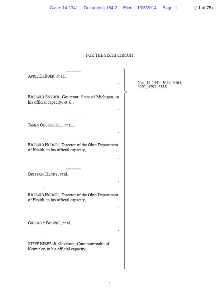 Aaron D. Lindstrom, OFFICE OF THE MICHIGAN ATTORNEY GENERAL, Lansing, Michigan, for Appellant in 14-1341. Carole M. Stanyar, Ann Arbor, Michigan, for Appellees in 14-1341. Eric E. Murphy, OFFICE OF THE OHIO ATTORNEY GENERAL, Columbus, Ohio, for Appellant in 14-3057 and 14-3464. Alphonse A. Gerhardstein, GERHARDSTEIN & BRANCH CO. LPA, Cincinnati, Ohio, for Appellees in 14-3057 and 14-3464. Leigh Gross Latherow, VANANTWERP, MONGE, JONES, EDWARDS & MCCANN, LLP, Ashland, Kentucky, for Appellant in 14-5291 and 14-5818. Laura E. Landenwich, CLAY DANIEL WALTON & ADAMS, PLC, Louisville, Kentucky, for Appellees in 14-5291 and 14-5818. Joseph F. Whalen, OFFICE OF THE TENNESSEE ATTORNEY GENERAL, Nashville, Tennessee, for Appellants in 14-5297. William L. Harbison, SHERRARD & ROE, PLC, Nashville, Tennessee, for Appellees in 14-5297.
