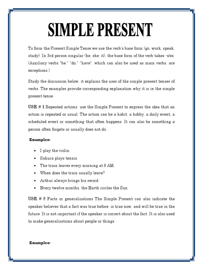 To form the Present Simple Tense we use the verb's base form (go, work, speak,