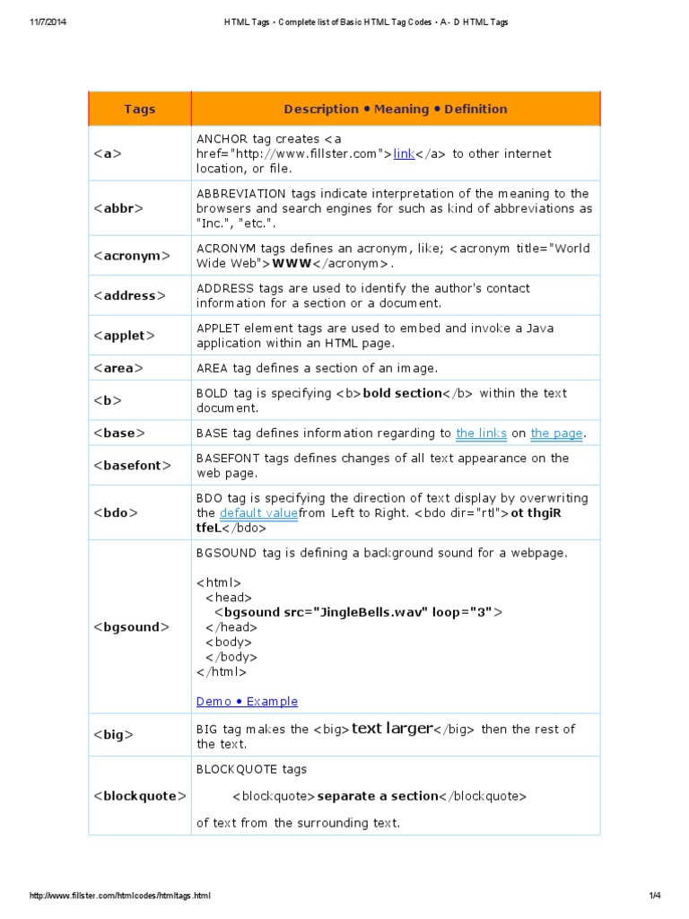 HTML Tags Complete list of Basic HTML Tag Codes A - D HTML Tags