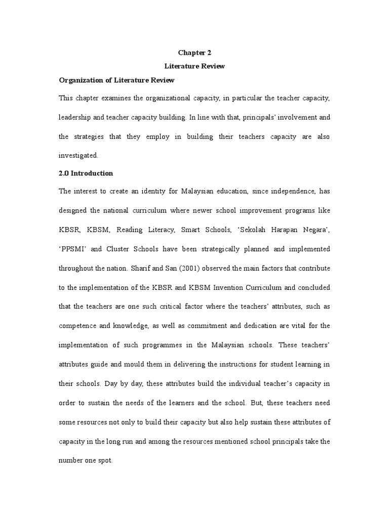 This chapter describes the related literature on capacity, school capacity, teacher