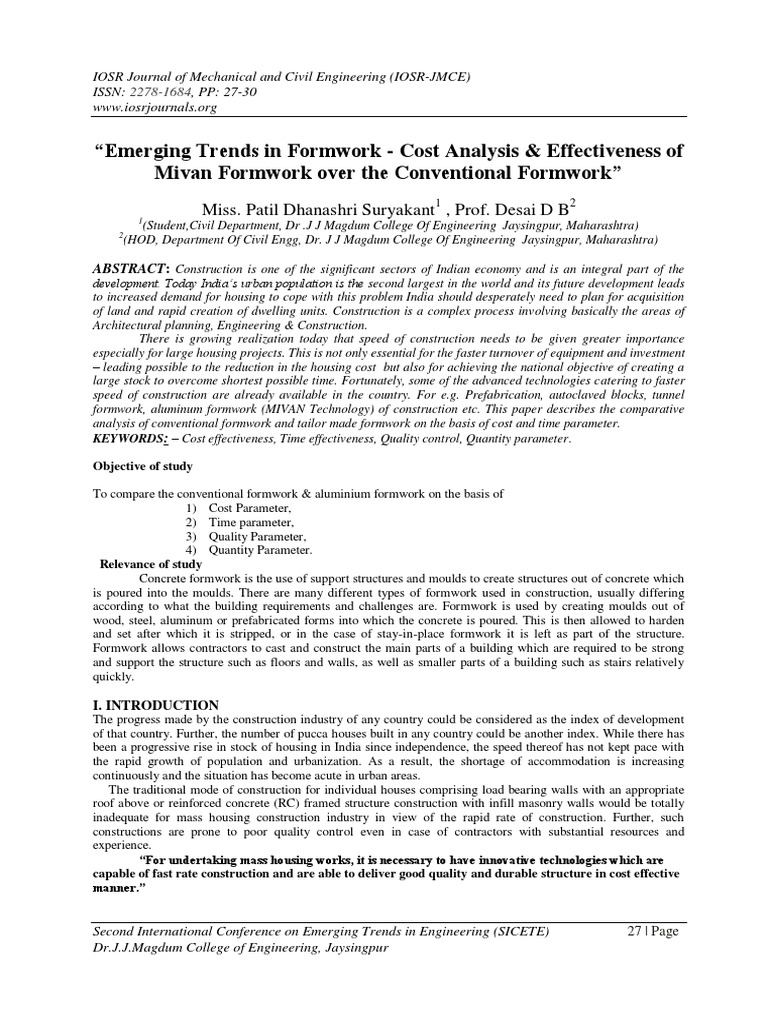 Emerging Trends in Formwork - Cost Analysis & Effectiveness of Mivan Formwork over the