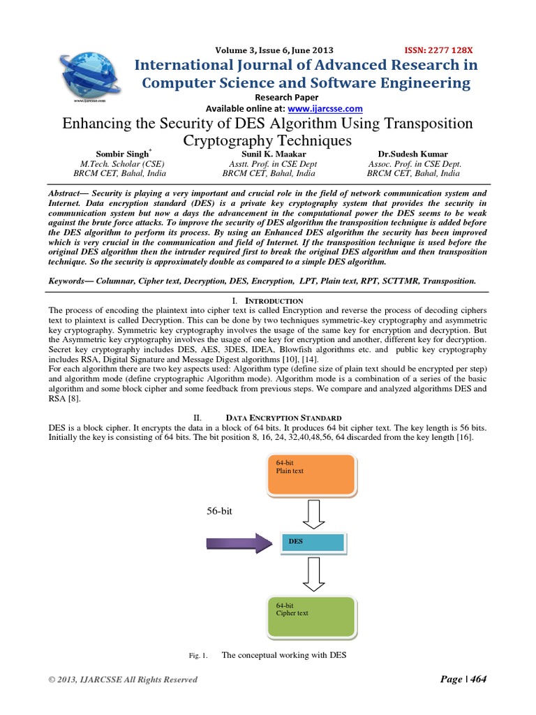 Keywords Columnar, Cipher text, Decryption, DES, Encryption, LPT, Plain text, RPT, SCTTMR, Transposition.