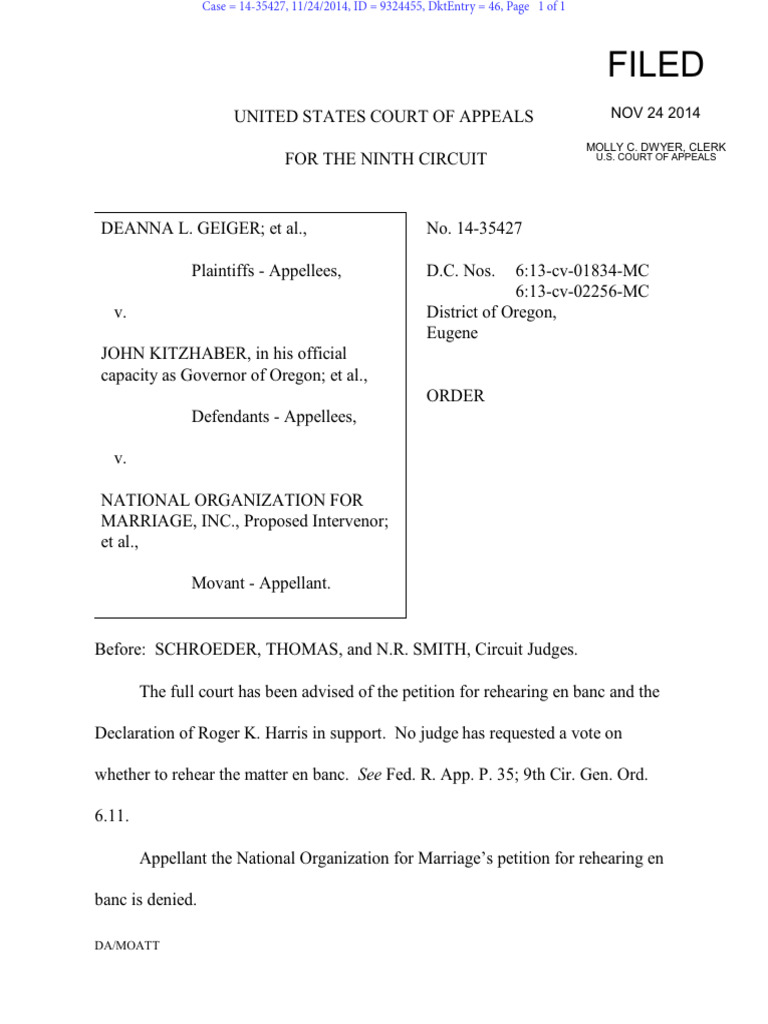 Doc 46 - Order denying NOM's petition for rehearing en banc
