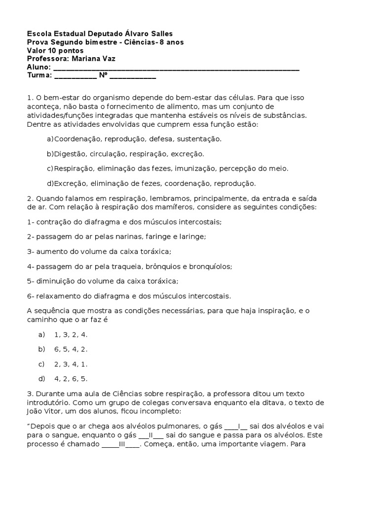 3. Durante uma aula de Cincias sobre respirao, a professora ditou um texto