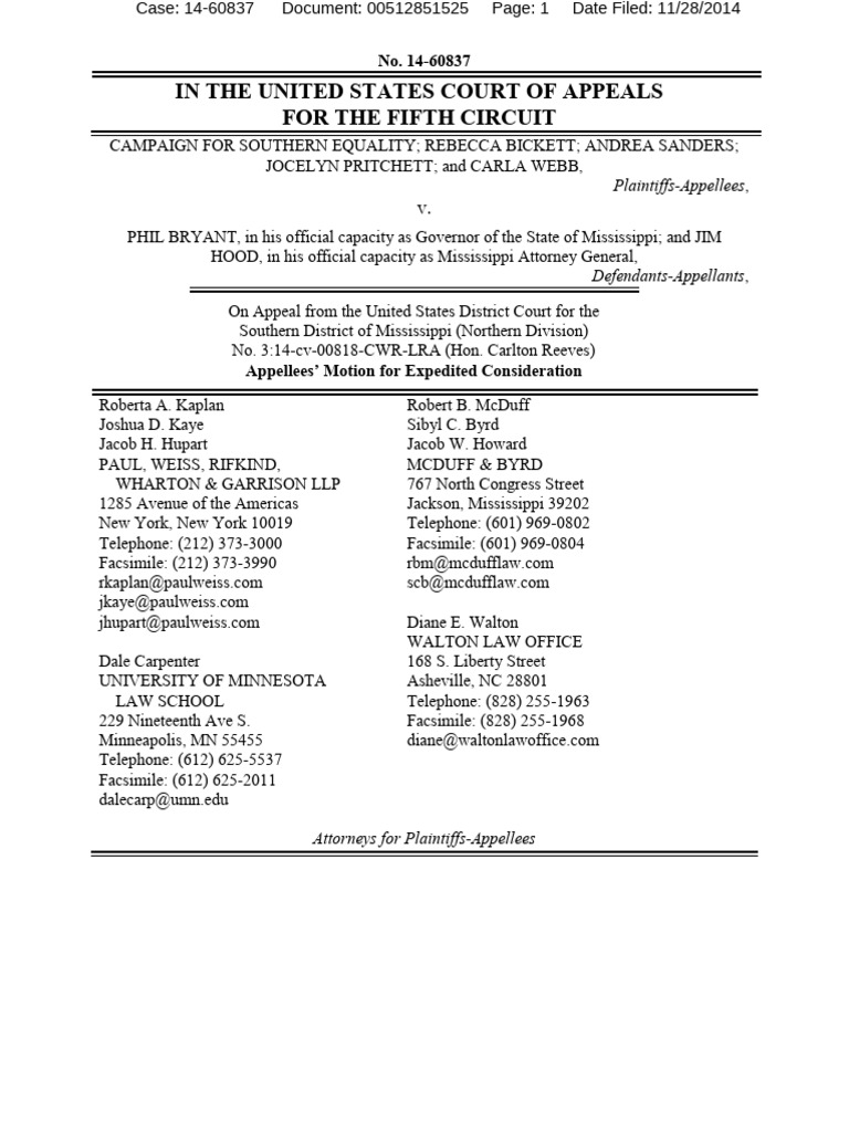 Roberta A. Kaplan Joshua D. Kaye Jacob H. Hupart PAUL, WEISS, RIFKIND, WHARTON & GARRISON LLP 1285 Avenue of the Americas New York, New York 10019 Telephone: (212) 373-3000 Facsimile: (212) 373-3990 rkaplan@paulweiss.com jkaye@paulweiss.com jhupart@paulweiss.com Dale Carpenter UNIVERSITY OF MINNESOTA LAW SCHOOL 229 Nineteenth Ave S. Minneapolis, MN 55455 Telephone: (612) 625-5537 Facsimile: (612) 625-2011 dalecarp@umn.edu Robert B. McDuff Sibyl C. Byrd Jacob W. Howard MCDUFF & BYRD 767 North Congress Street Jackson, Mississippi 39202 Telephone: (601) 969-0802 Facsimile: (601) 969-0804 rbm@mcdufflaw.com scb@mcdufflaw.com Diane E. Walton WALTON LAW OFFICE 168 S. Liberty Street Asheville, NC 28801 Telephone: (828) 255-1963 Facsimile: (828) 255-1968 diane@waltonlawoffice.com