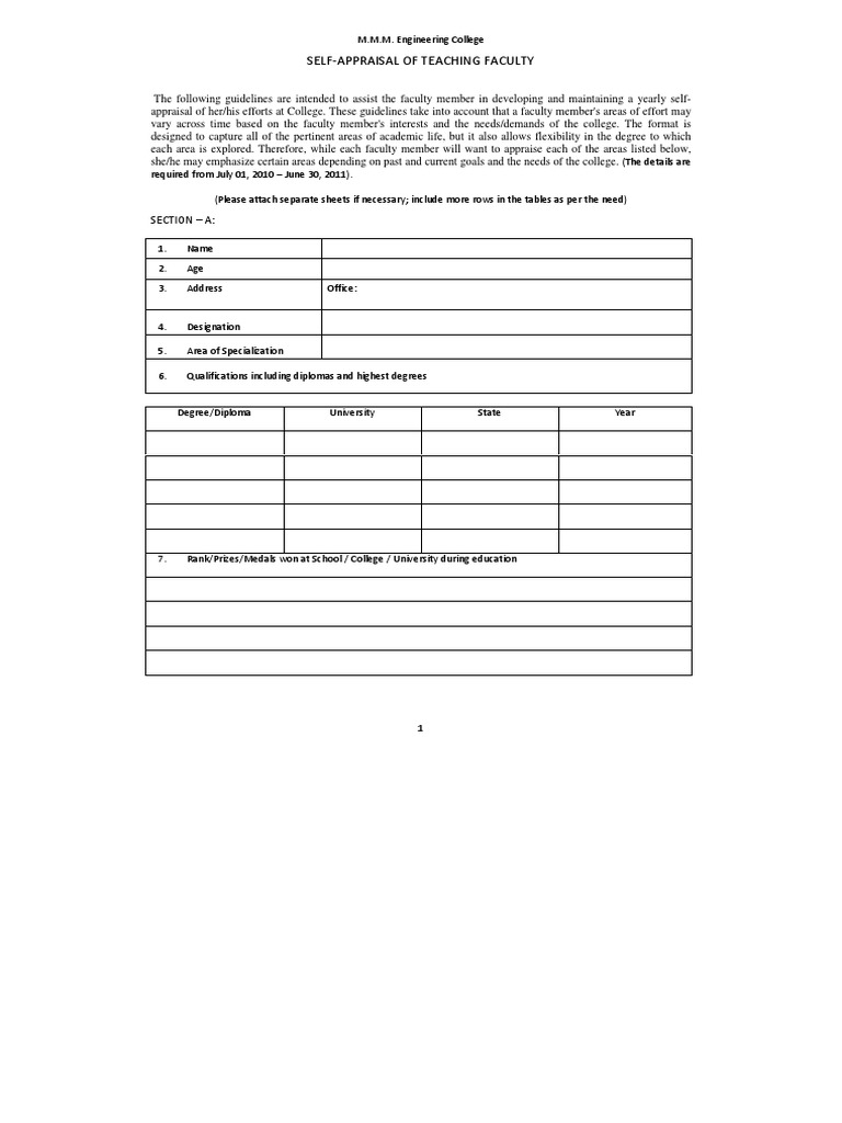 The following guidelines are intended to assist the faculty member in developing and maintaining a yearly selfappraisal of her/his efforts at College. These guidelines take into account that a faculty member's areas of effort may