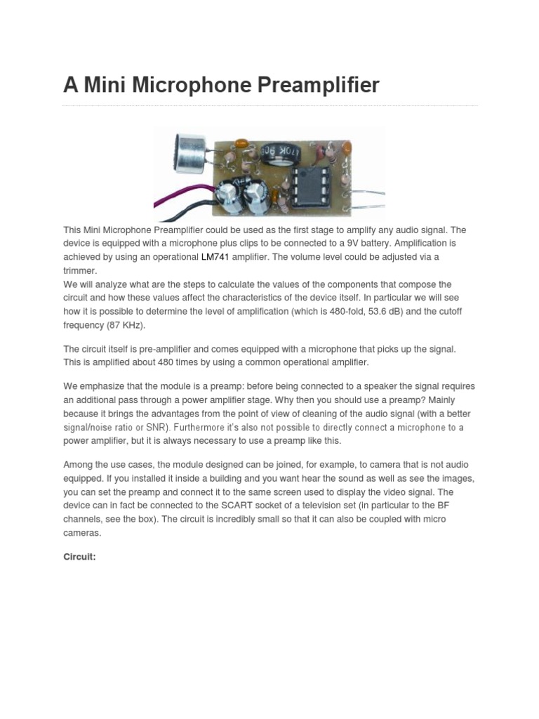 This Mini Microphone Preamplifier could be used as the first stage to amplify any audio signal. The