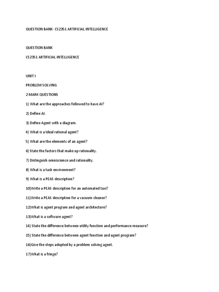 QUESTION BANK- CS2351 ARTIFICIAL INTELLIGENCE