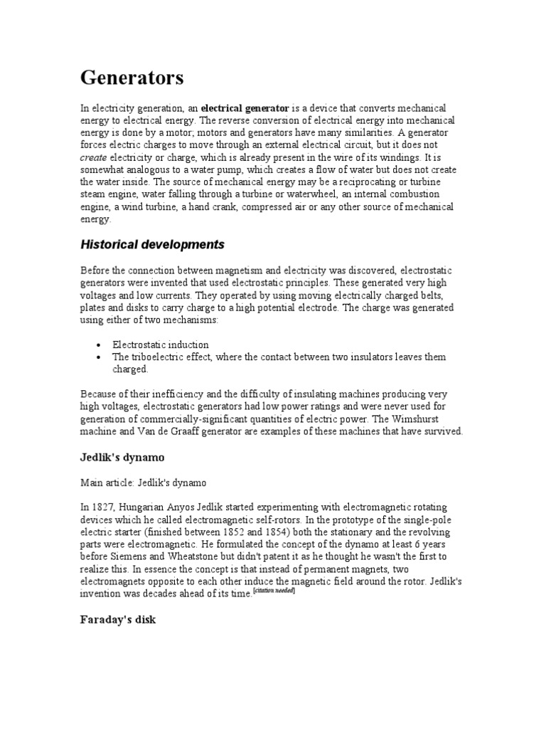 In electricity generation, an electrical generator is a device that converts mechanical