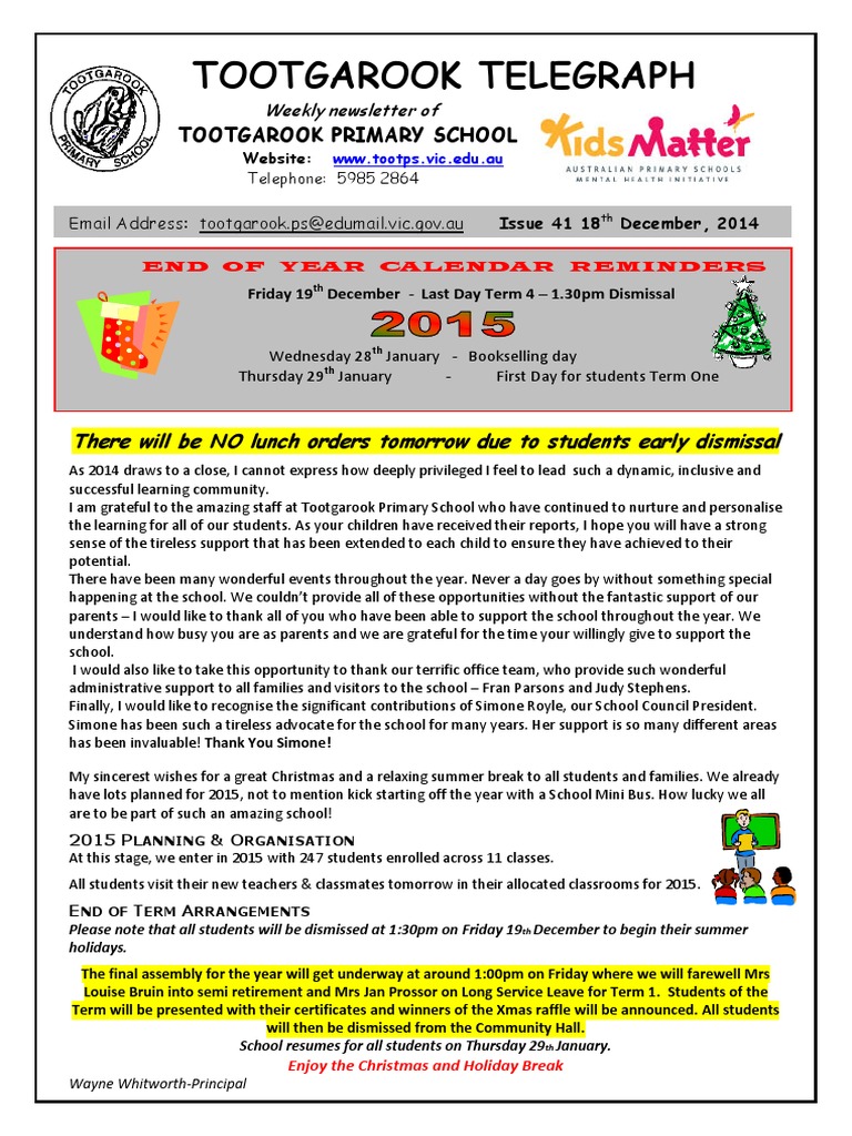 Friday 19th December - Last Day Term 4 1.30pm Dismissal