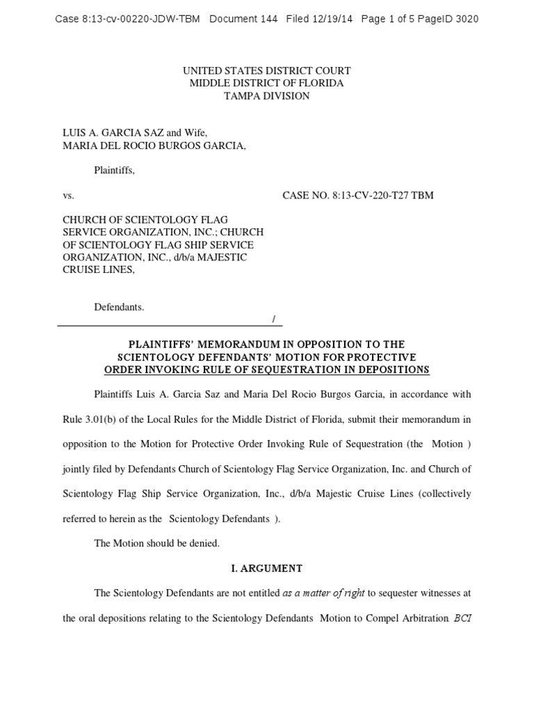 UNITED STATES DISTRICT COURT MIDDLE DISTRICT OF FLORIDA TAMPA DIVISION LUIS A. GARCIA SAZ and Wife, MARIA DEL ROCIO BURGOS GARCIA, Plaintiffs, vs. CASE NO. 8:13-CV-220-T27 TBM CHURCH OF SCIENTOLOGY FLAG SERVICE ORGANIZATION, INC.; CHURCH OF SCIENTOLOGY FLAG SHIP SERVICE ORGANIZATION, INC., d/b/a MAJESTIC CRUISE LINES, Defendants.