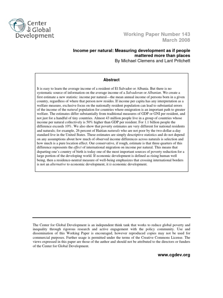 of international migration on income per natural. This means that departing one’s country of birth is today one of the most important sources of poverty reduction for a large portion of the developing world. If economic development is defined as rising human well being, then a residence-neutral measure of well-being emphasizes that crossing international borders is not an