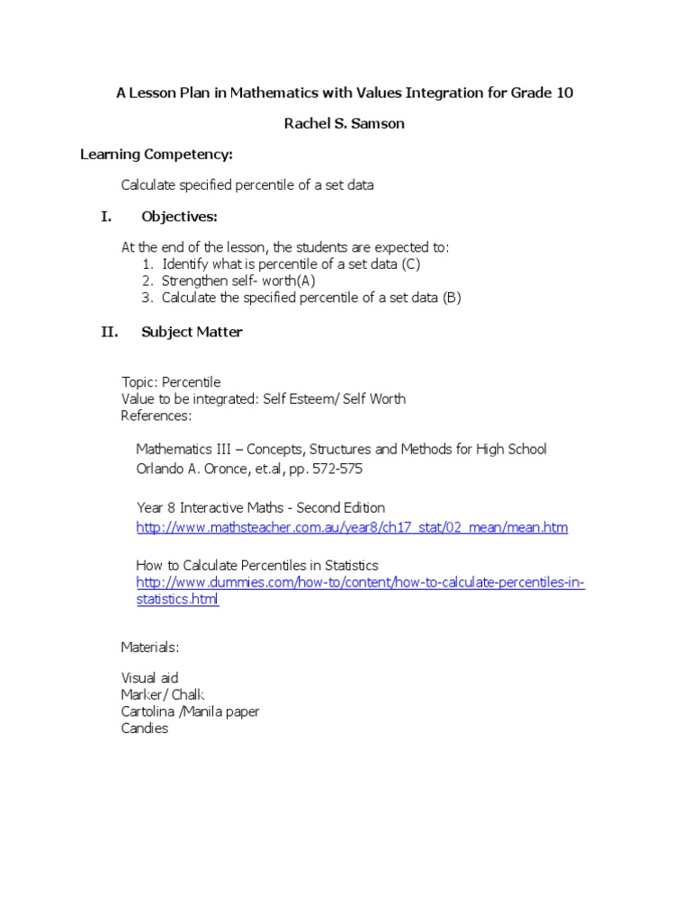A Lesson Plan in Mathematics with Values Integration for Grade 10