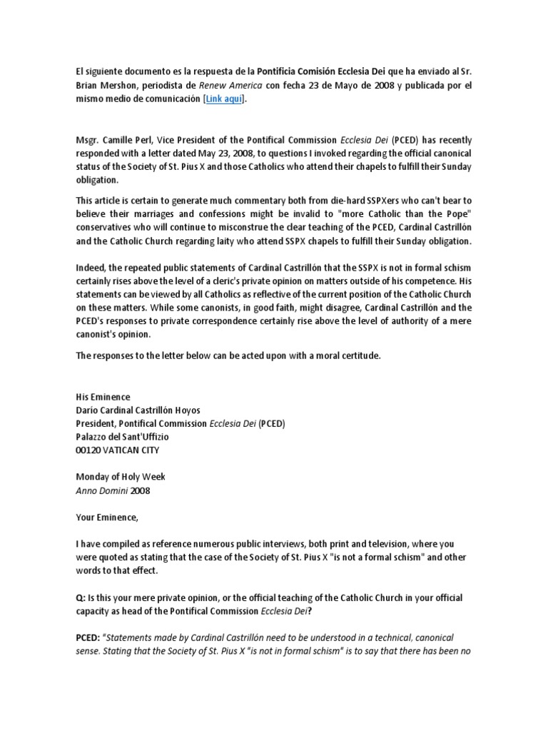 El siguiente documento es la respuesta de la Pontificia Comisin Ecclesia Dei que ha enviado al Sr.