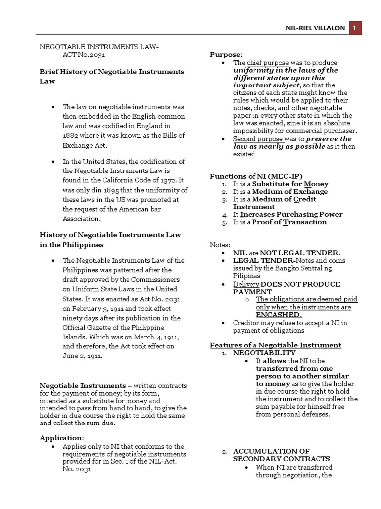 The Negotiable Instruments Law of the