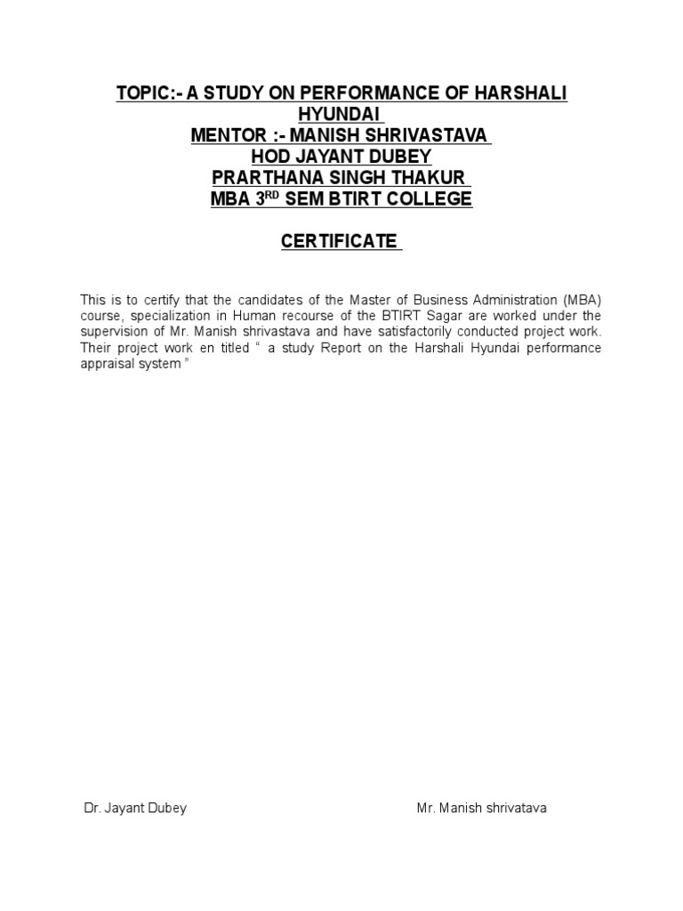 Their project work en titled a study Report on the Harshali Hyundai performance