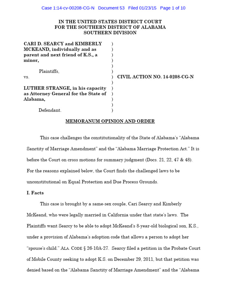 This case is brought by a same-sex couple, Cari Searcy and Kimberly McKeand, who were legally married in California under that state’s laws. The Plaintiffs want Searcy to be able to adopt McKeand’s 8-year-old biological son, K.S., under a provision of Alabama’s adoption code that allows a person to adopt her “spouse’s child.” A