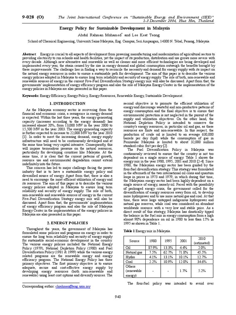 Energy Policy for Sustainable Development in Malaysia