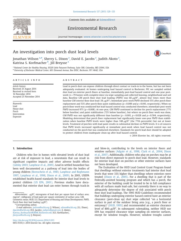 oor surfaces, the weather conditions, soil coverage, andpresence of other lead point sources in the neighborhood duringthe three phases of the study (before intervention, immediatelyafter work was completed, and again one year post-work). Thelocal lead hazard control program determined if porches should betreated or not. Out of the enrolled homes, 92 underwent leadhazard control. The risk assessors sampled porch dust within onemonth of being noti