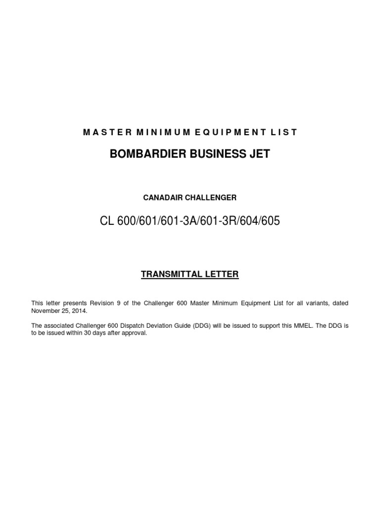 This letter presents Revision 9 of the Challenger 600 Master Minimum Equipment List for all variants, dated