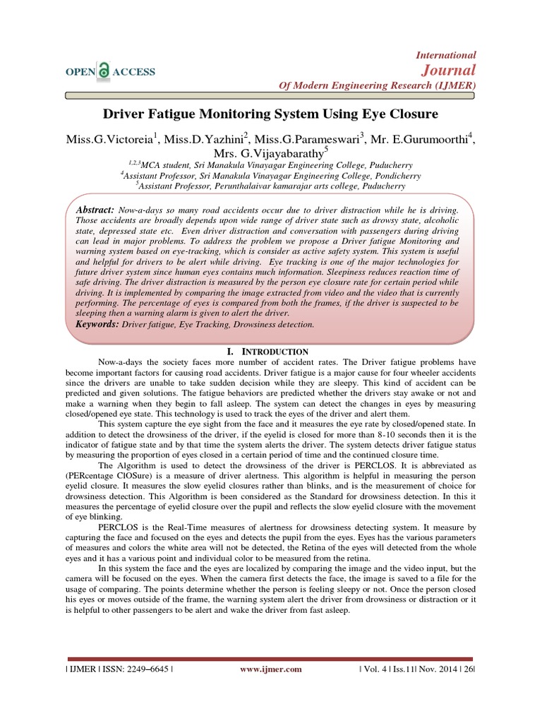 Keywords: Driver fatigue, Eye Tracking, Drowsiness detection.