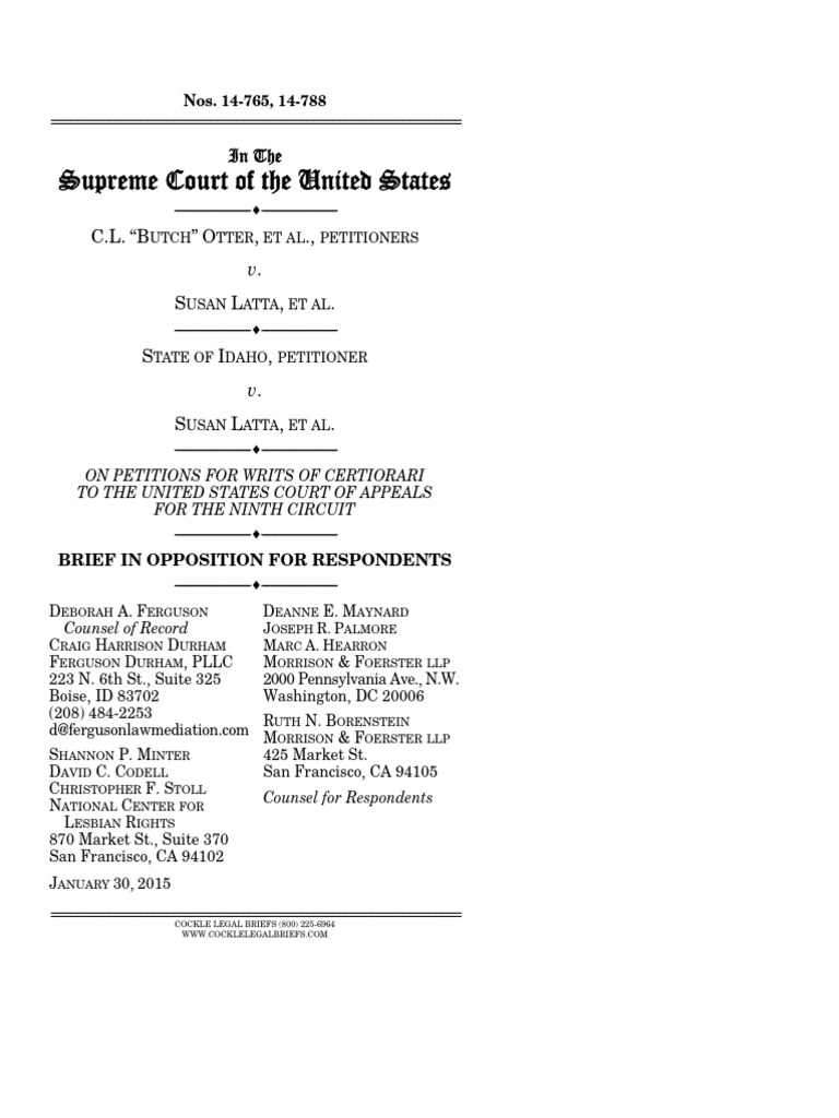 ii TABLE OF CONTENTS Page QUESTION PRESENTED ..................................... i TABLE OF AUTHORITIES ................................... iv OPINIONS BELOW ............................................... 1 JURISDICTION ..................................................... 1 STATEMENT .......................................................... 1 A. Legal Framework ......................................... 1 B. Factual Background .................................... 3 C. Proceedings Below ....................................... 7 1. Proceedings in the district court ........... 7 2. Proceedings in the court of appeals ...... 8 3. Subsequent developments ................... 11 REASONS FOR DENYING THE PETITION ..... 12 I. THERE IS NO BASIS FOR GRANTING THE PETITIONS ......................................... 13 II. THE PETITIONS SHOULD BE DENIED RATHER THAN HELD ............................. 16 III. THE COURT OF APPEALS’ DECISION IS CORRECT ............................................. 18 A. Idaho’s Marriage Ban Denies Same-Sex Couples The Fundamental Right To Marry ................................................ 19 B. Idaho’s Marriage Ban Discriminates On The Basis Of Sexual Orientation And Gender, In Violation Of The Equal Protection Clause .................................. 22