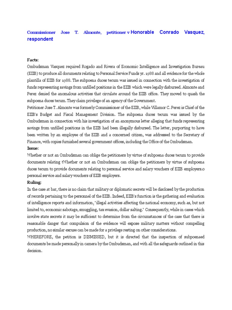 Petitioner Jose T. Almonte was formerly Commissioner of the EIIB, while Villamor C. Perez is Chief of the