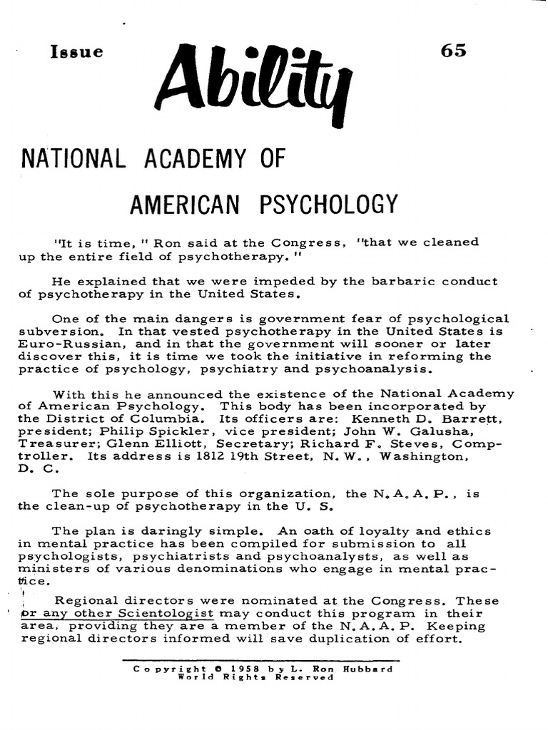 Scientology magazine announcing the National Academy of American Psychology