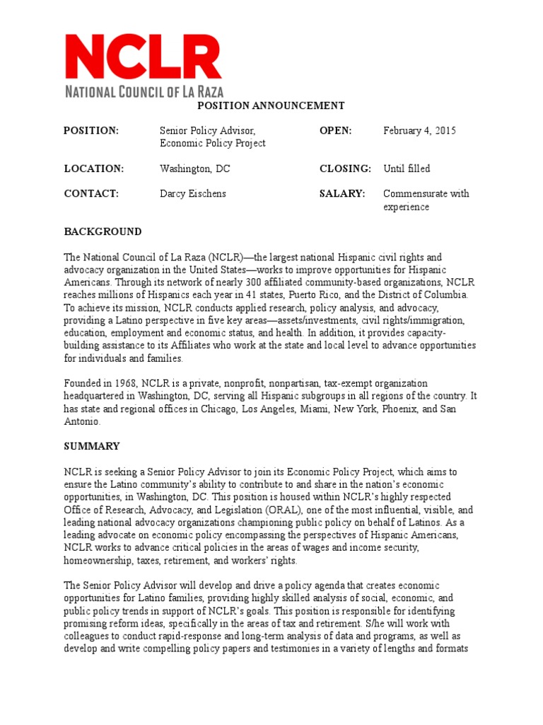 NCLR is seeking a Senior Policy Advisor to join its Economic Policy Project, which aims to
