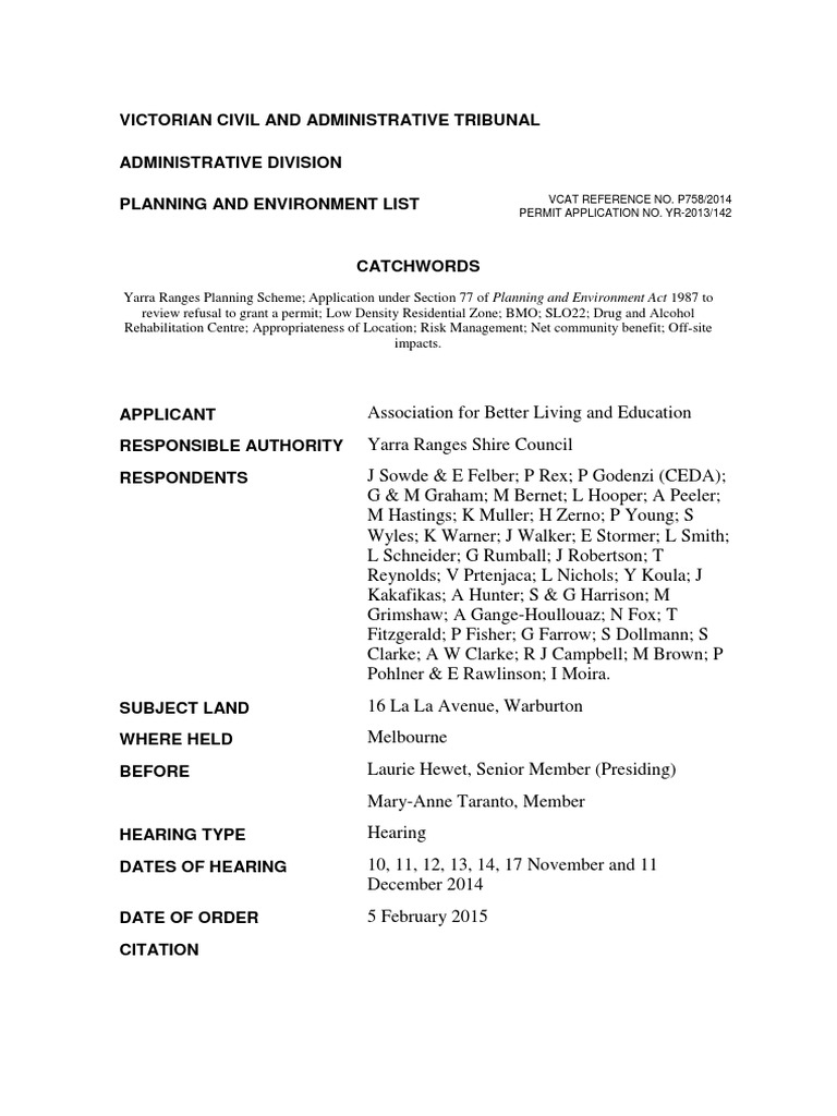 1987 to review refusal to grant a permit; Low Density Residential Zone; BMO; SLO22; Drug and Alcohol Rehabilitation Centre; Appropriateness of Location; Risk Management; Net community benefit; Off-site impacts.