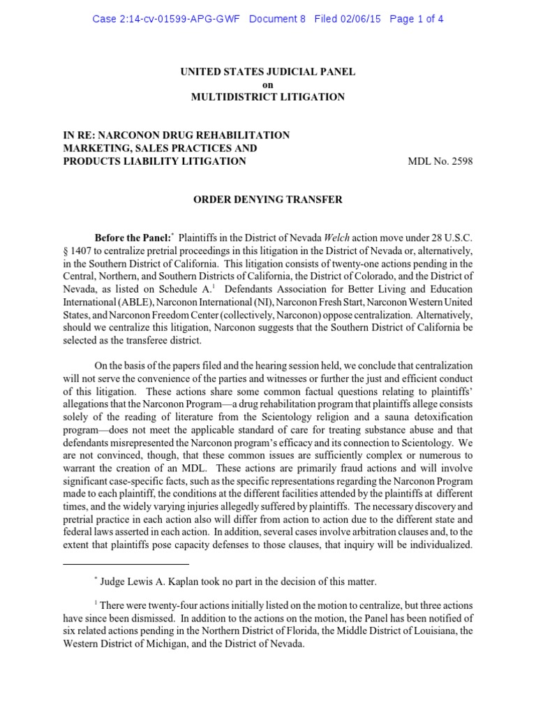 International (ABLE), Narconon International (NI), Narconon Fresh Start, Narconon Western UnitedStates, and Narconon Freedom Center (collectively, Narconon) oppose centralization. Alternatively,should we centralize this litigation, Narconon suggests that the Southern District of California beselected as the transferee district. On the basis of the papers filed and the hearing session held, we conclude that centralizationwill not serve the convenience of the parties and witnesses or further the just and efficient conductof this litigation. These actions share some common factual questions relating to plaintiffs’allegations that the Narconon Program—a drug rehabilitation program that plaintiffs allege consistssolely of the reading of literature from the Scientology religion and a sauna detoxification program—does not meet the applicable standard of care for treating substance abuse and thatdefendants misrepresented the Narconon program’s efficacy and its connection to Scientology. Weare not convinced, though, that these common issues are sufficiently complex or numerous towarrant the creation of an MDL. These actions are primarily fraud actions and will involvesignificant case-specific facts, such as the specific representations regarding the Narconon Programmade to each plaintiff, the conditions at the different facilities attended by the plaintiffs at differenttimes, and the widely varying injuries allegedly suffered by plaintiffs. The necessary discovery and pretrial practice in each action also will differ from action to action due to the different state andfederal laws asserted in each action. In addition, several cases involve arbitration clauses and, to theextent that plaintiffs pose capacity defenses to those clauses, that inquiry will be individualized. Judge Lewis A. Kaplan took no part in the decision of this matter.