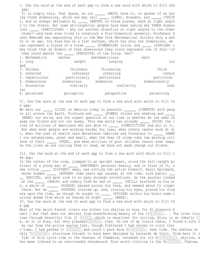 III. Use the word at the end of each gap to form a new word with which to fill t
