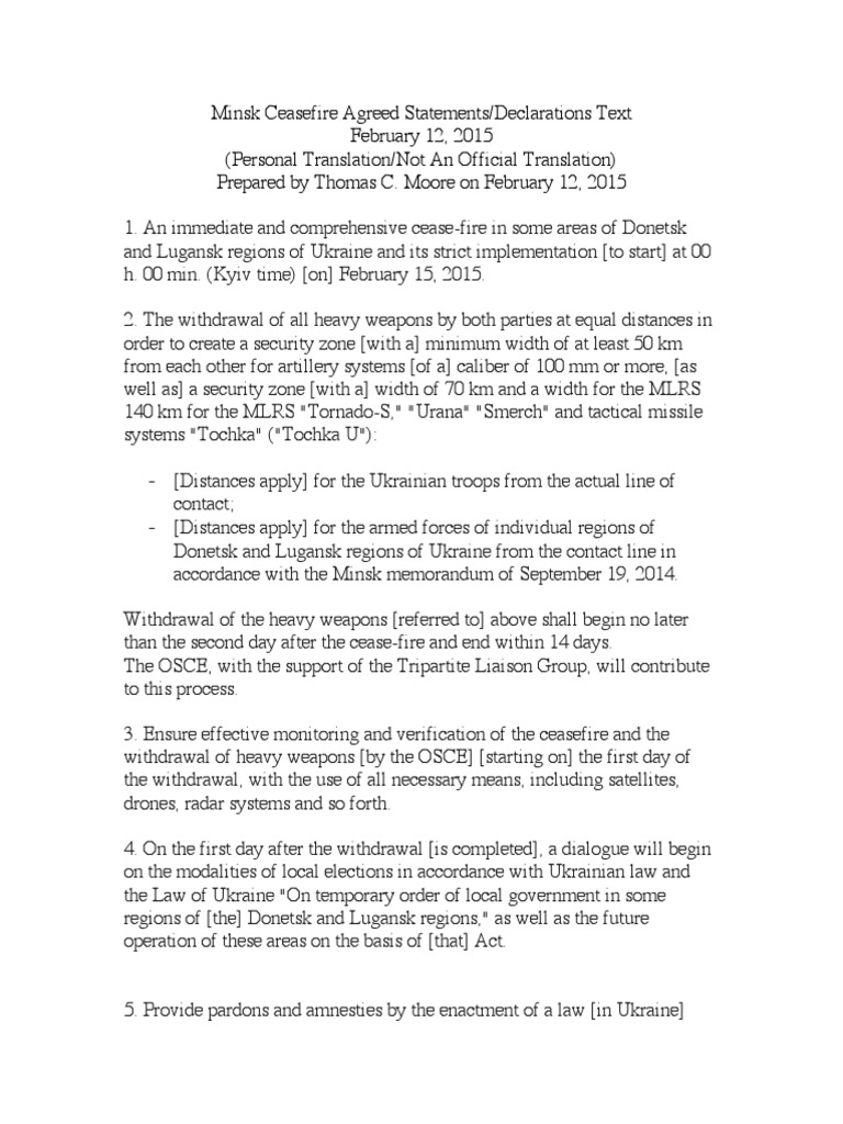 Minsk Ceasefire Agreed Statements/Declarations Text February 12, 2015 (Personal Translation/Not An Official Translation) Prepared by Thomas C. Moore on February 12, 2015