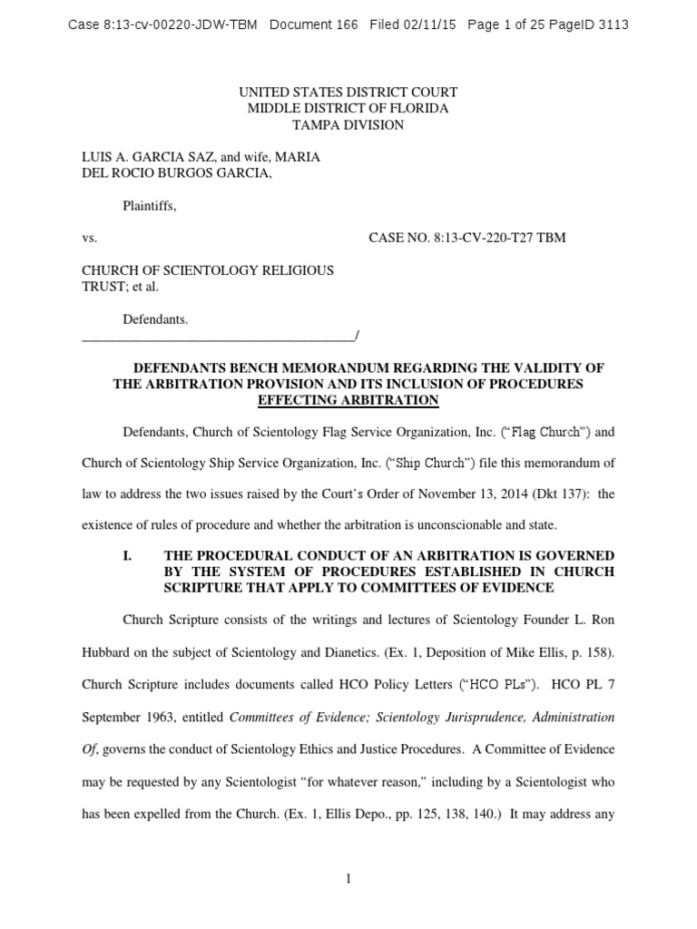.) Scientologists are taught those principles through participation in Scientology training and courses. Plaintiff Luis Garcia participated in precisely such a course, and fully understood and agreed with the principle of internal dispute resolution through the Scientology justice system. Thus, Mr. Garcia testified: I was familiar with all the ethics procedures and justice procedures. And I knew there was a system whereby Scientologists could settle disputes, have hearings . . . . And I used some things of the system. . . . I was aware of the committees of evidence, I knew how that worked. I mean, most Scientologists do because they study them. We study this book, and we study . . . the ethics specialty course, and we become well versed on how these things are supposed to work. (Ex. 2, Deposition of Luis Garcia, pp. 23-24, 46-48.) In agreeing to arbitration, the Plaintiffs signed numerous enrollment agreements over many years. The enrollment agreements directly at issue here are the agreements that Plaintiffs signed with Defendants Flag Church and Ship Church. Those agreements, with which the Court is now familiar, specifically provide that if a dispute arises between the Plaintiffs and any Scientology church or entity, the Plaintiffs will not seek relief in the civil courts, but will submit such disputes to resolution through the Scientology system of dispute resolution procedures. Accordingly, the Enrollment Agreements at issue here specifically provide that the Plaintiffs will seek resolution of any such dispute