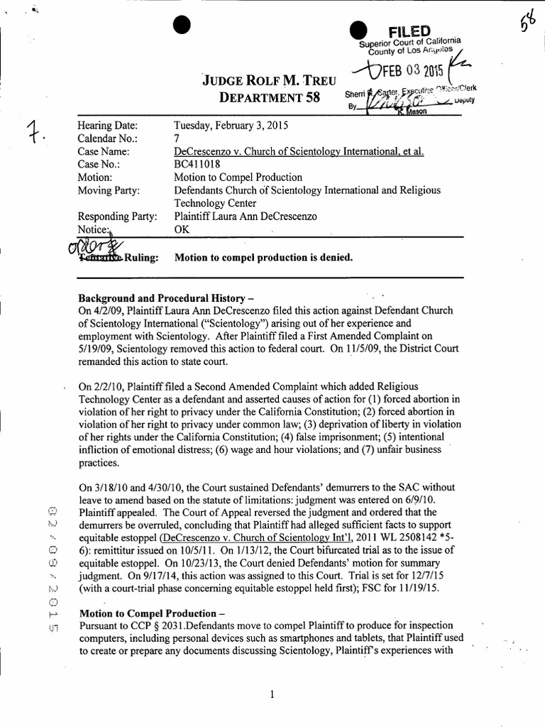 DeCrescenzo v. Scientology: Ruling Motion to Compel