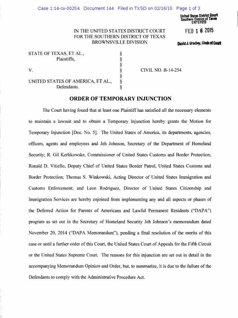 Order of Temporary Injunction - Texas v. United States