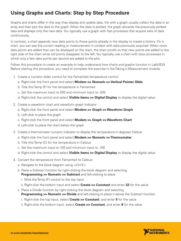 Graphs and charts differ in the way they display and update data. VIs with a graph usually collect the data in an