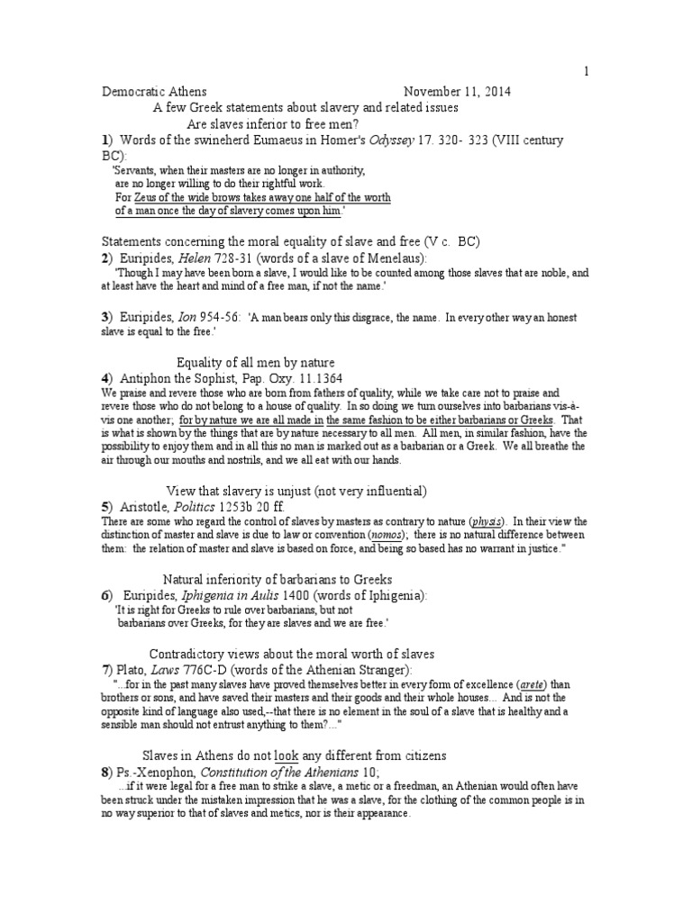 Statements concerning the moral equality of slave and free (V c. BC)
