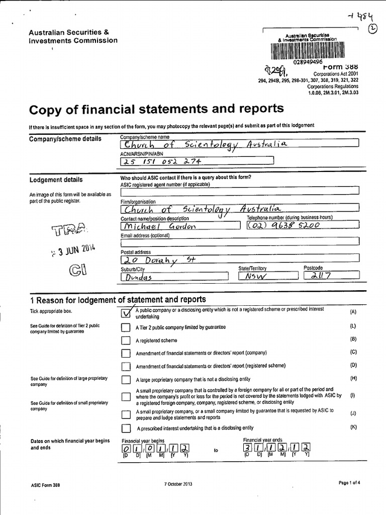Scientology Australia's annual financial report 2012, as submitted to ASIC