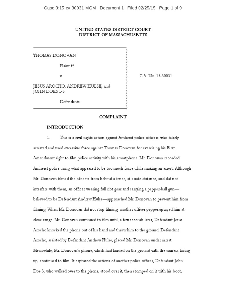 A University of Massachusetts-Amherst student filed a civil rights lawsuit alleging he was assaulted and falsely arrested for videotaping police activity at the 2014 "Blarney Blowout."