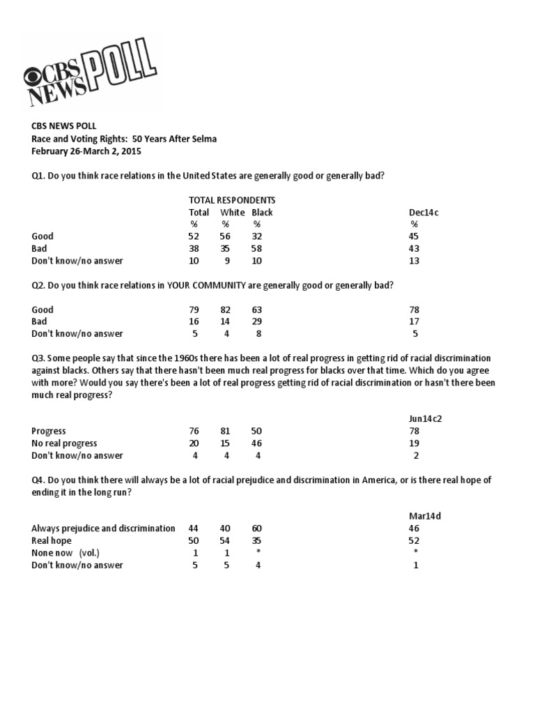 Q1. Do you think race relations in the United States are generally good or generally bad? TOTAL RESPONDENTS TotalWhiteBlackDec14c % % % % Good52563245 Bad38355843 Don't know/no answer10 91013 Q2. Do you think race relations in YOUR COMMUNITY are generally good or generally bad? Good79826378 Bad16142917 Don't know/no answer 5 4 8 5 Q3. Some people say that since the 1960s there has been a lot of real progress in getting rid of racial discrimination against blacks. Others say that there hasn't been much real progress for blacks over that time. Which do you agree with more? Would you say there's been a lot of real progress getting rid of racial discrimination or hasn't there been much real progress? Jun14c2 Progress76815078 No real progress20154619 Don't know/no answer 4 4 4 2 Q4. Do you think there will always be a lot of racial prejudice and discrimination in America, or is there real hope of ending it in the long run? Mar14d Always prejudice and discrimination44406046 Real hope50543552 None now (vol.) 1 1 * * Don't know/no answer 5 5 4 1