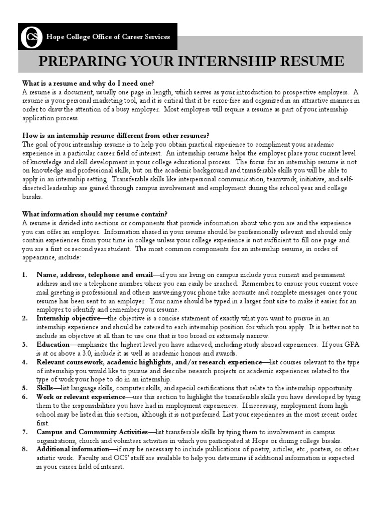 of knowledge and skill development in your college educational process. The focus for an internship resume is not