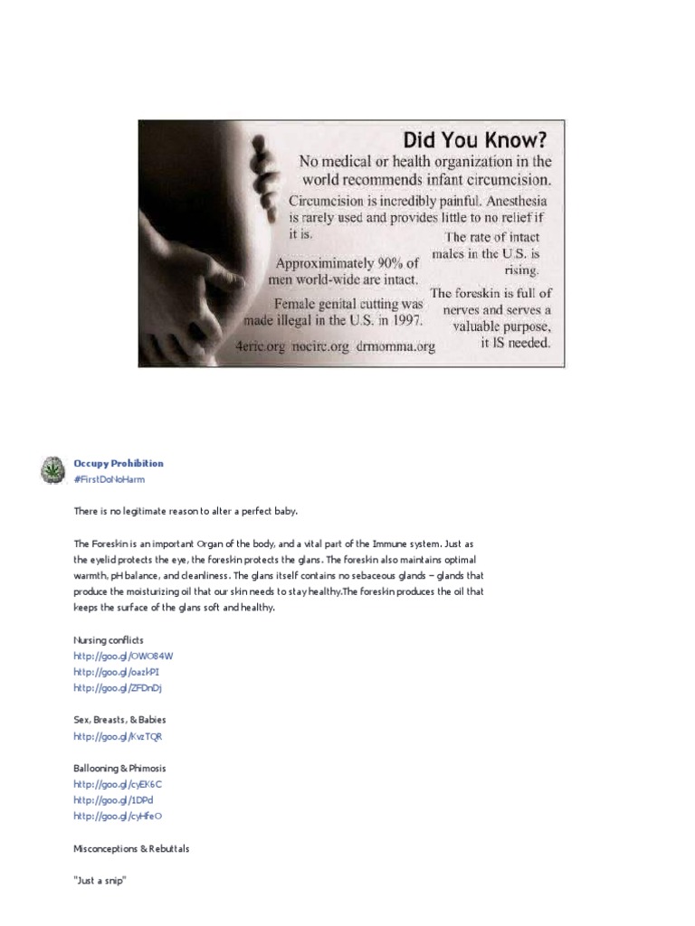 #FirstDoNoHarmThere is no legitimate reason to alter a perfect baby.The Foreskin is an important Organ of the body, and a vital part of the Immune system. Just asthe eyelid protects the eye, the foreskin protects the glans. The foreskin also maintains optimalwarmth, pH balance, and cleanliness. The glans itself contains no sebaceous glands – glands thatproduce the moisturizing oil that our skin needs to stay healthy.The foreskin produces the oil thatkeeps the surface of the glans soft and healthy.Nursing conflictshttp://goo.gl/OWO84Whttp://goo.gl/oazkPIhttp://goo.gl/ZFDnDjSex, Breasts, & Babieshttp://goo.gl/KvzTQR Ballooning & Phimosishttp://goo.gl/cyEK6Chttp://goo.gl/1DPdhttp://goo.gl/cyHfeOMisconceptions & Rebuttals"Just a snip"