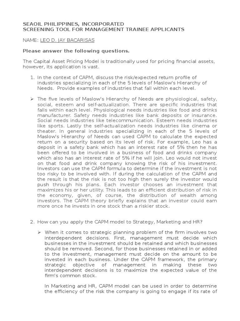 2. How can you apply the CAPM model to Strategy, Marketing and HR?