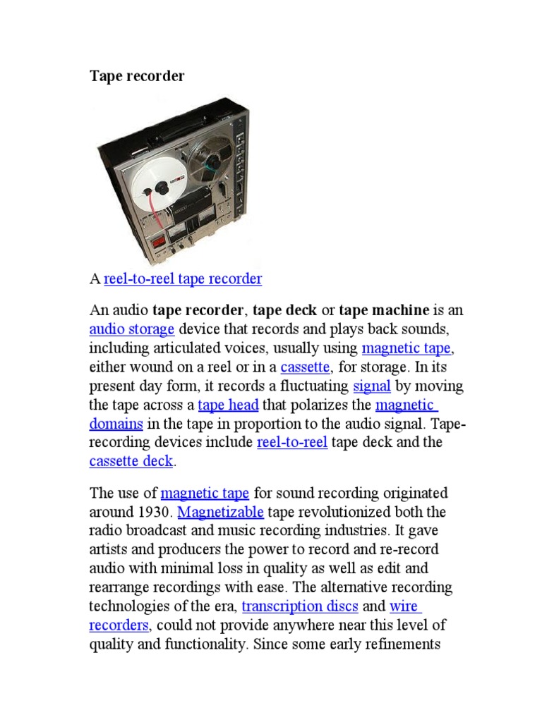 domains in the tape in proportion to the audio signal. Taperecording devices include reel-to-reel tape deck and the