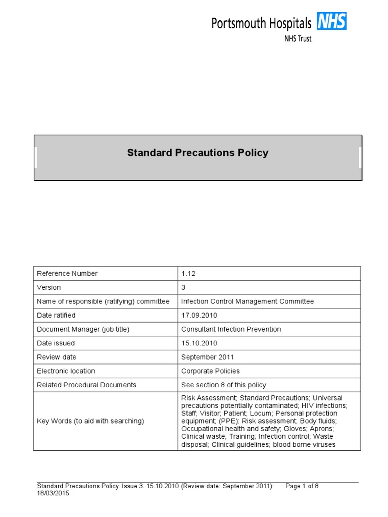 Standard Precautions Policy. Issue 3. 15.10.2010 (Review date: September 2011):